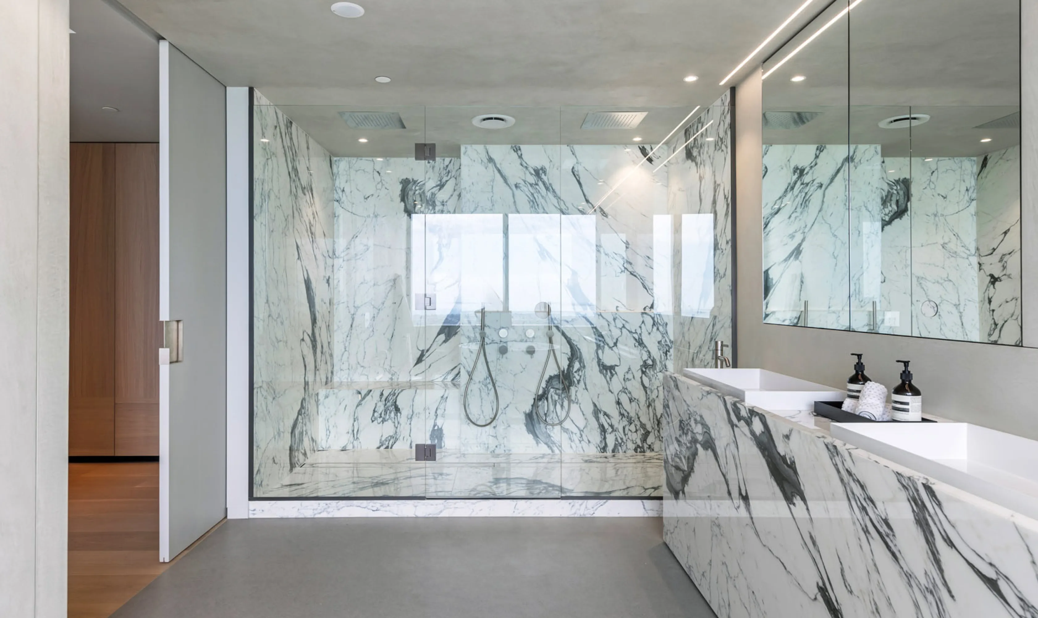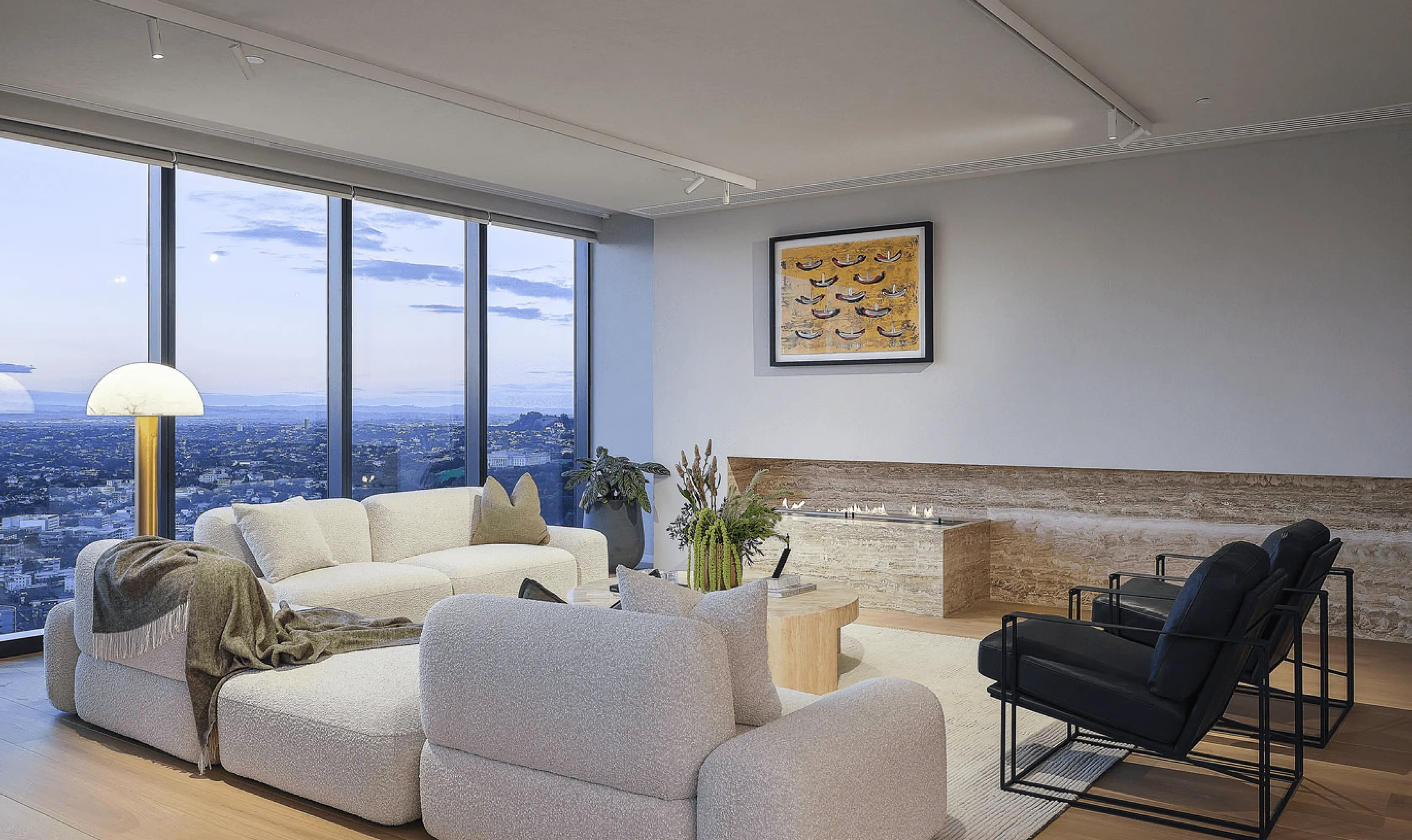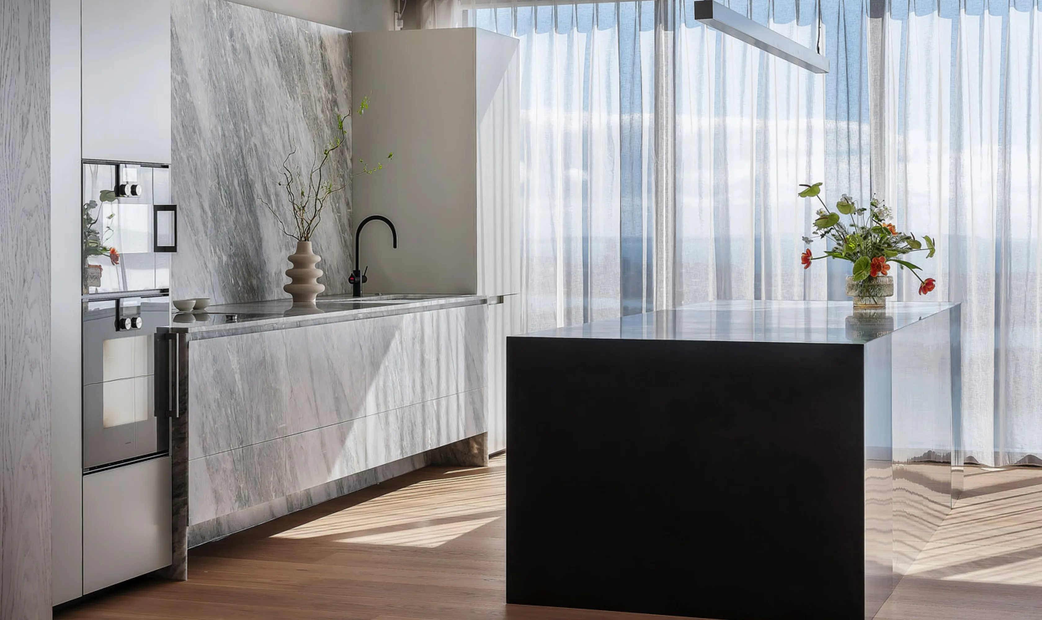 As you enter the living room, you find yourself encapsulated in breathtaking cityscapes that stream through floor-to-ceiling windows, complemented by light timber hues and a gourmet marble kitchen, complete with Gaggenau appliances, a cleverly-hidden butler’s pantry and wine bar.